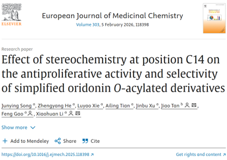 天然产物成药性研究团队完成的最新研究成果,论文题为“Effect of stereochemistry at position C14 on the antiproliferative activity and selectivity of simplified oridonin O‑acylated derivatives”。2022级硕士研究生宋俊英为第一作者,谭娇、高峰教授和李晓欢副教授为共同通讯作者,西南交通大学为第一通讯单位。