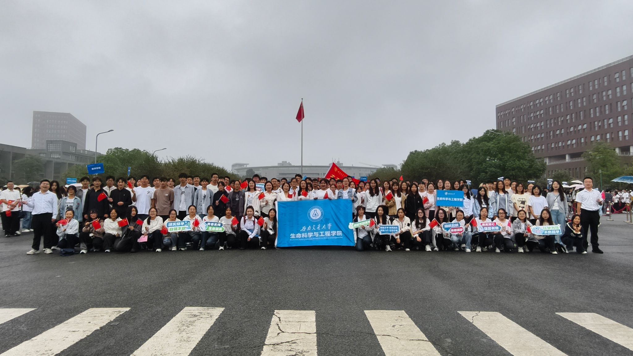 为庆祝中华人民共和国成立76周年,深入学习贯彻习近平新时代中国特色社会主义思想,弘扬爱国主义精神,10月1日上午,学校在犀浦校区东门国旗台庄严举行升国旗仪式。学院党委书记黄春蓉、党委副书记高鹏、团委书记杨颖增、团委副书记许青、潘星宇,2025级新生辅导员金鹏帆、贺晶晶、严开惠,以及学院学生会、研究生会、团建中心等团学组织负责人和各年级学生代表共计200余人在犀浦和九里两校区参加了本次活动。