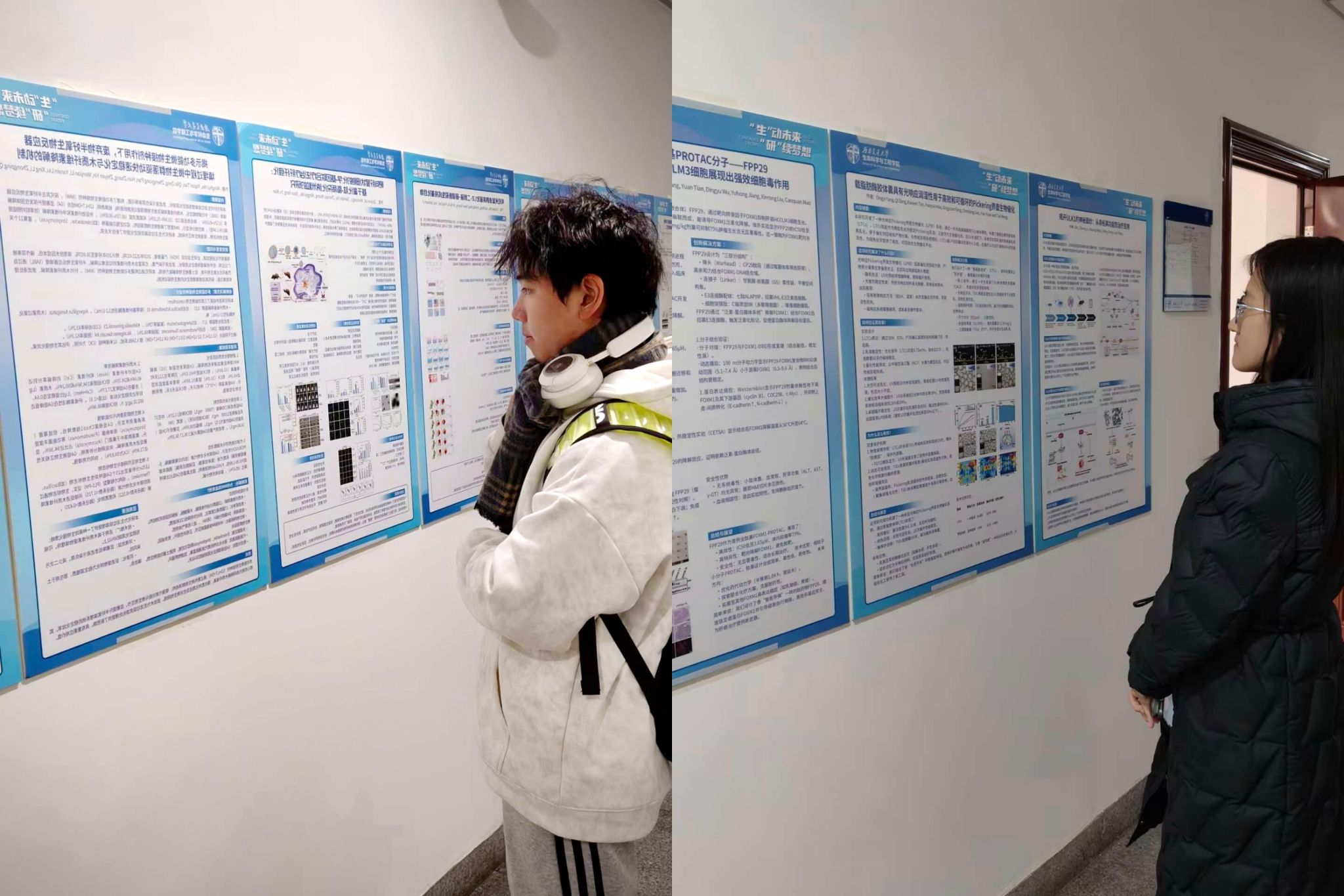 活动现场同步设置了学术墙报展示区,集中展出19项优秀学术成果,涵盖天然药物化学、环境微生物技术、药物递送与载体材料、脑卒中靶向治疗等多个前沿领域,以图文形式拓展了学术交流的维度,激发了同学们的探究热情。