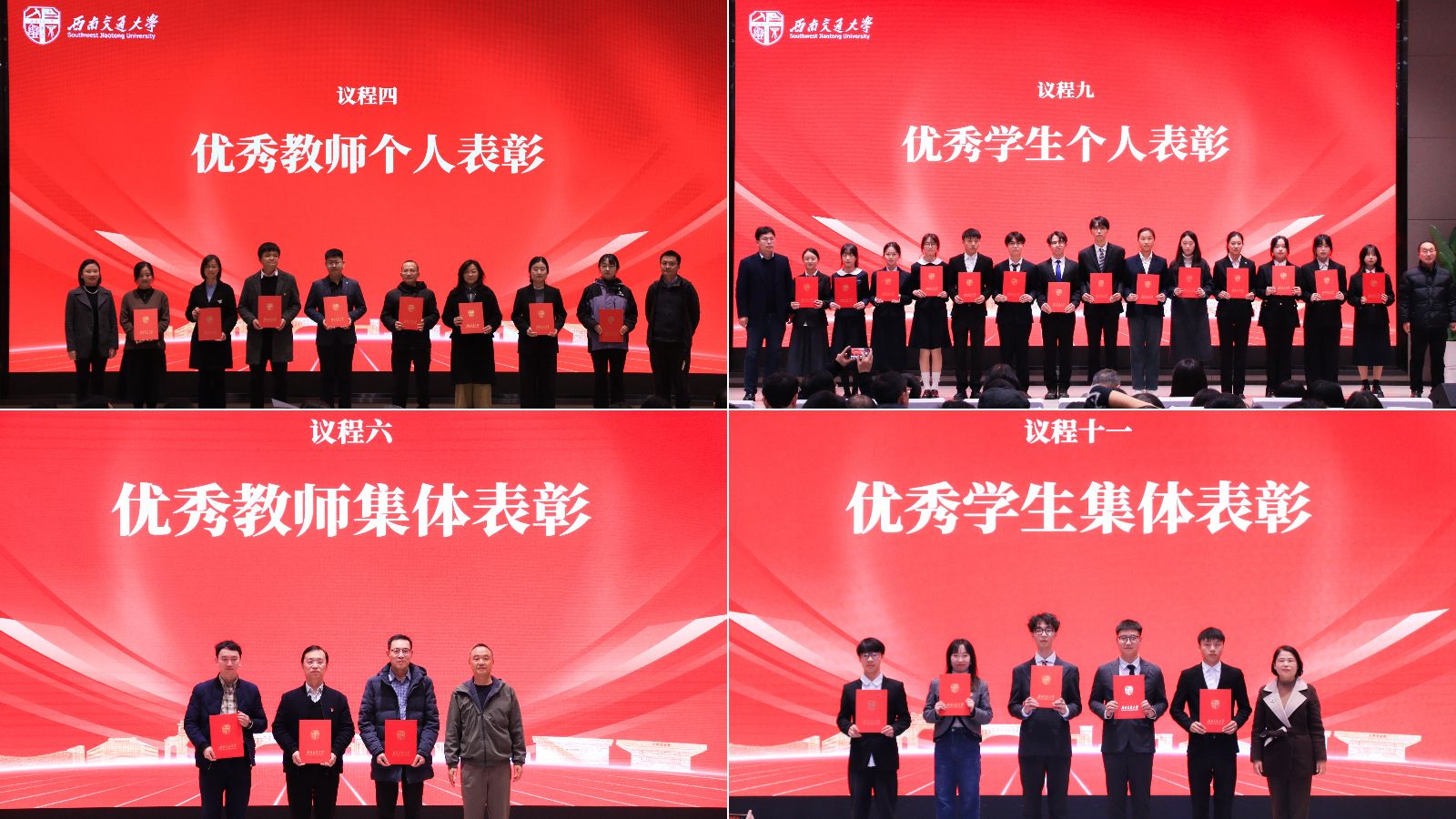 学院对师生年度优秀集体与先进个人进行了表彰。学院党政领导与“融通共育”专项指导老师分别为获奖教师、学生、班集体、团支部及科研团队等颁发荣誉证书,充分肯定了获奖师生与集体在教书育人、科研创新、学风建设和全面发展等方面的突出表现,生动彰显了av直播师生“竢实扬华、自强不息”的精神风貌。