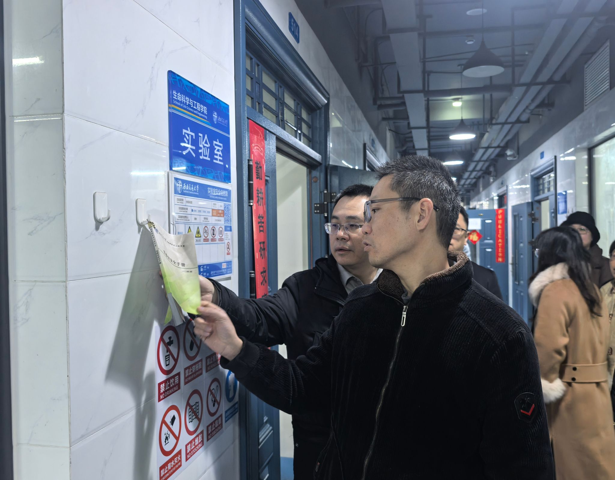 两院党委书记和实验室工作负责人带队对科技工业园A座、C座区域的实验室进行了安全检查。在检查过程中,老师们对实验室基础设施安全、空间布局利用、消防应急设施、危化品与废液废渣管理、特殊仪器使用管理、实验室标识与卫生等方面进行了探讨。